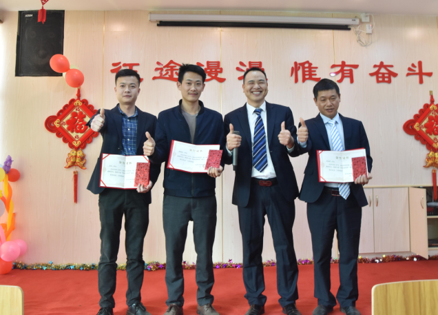 總助韋繼初為陽(yáng)專、胡賽、羅曉明頒發(fā)優(yōu)秀管理獎(jiǎng)